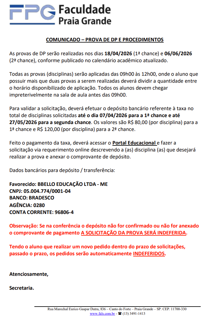 COMUNICADO – PROVA DE DP E PROCEDIMENTOS